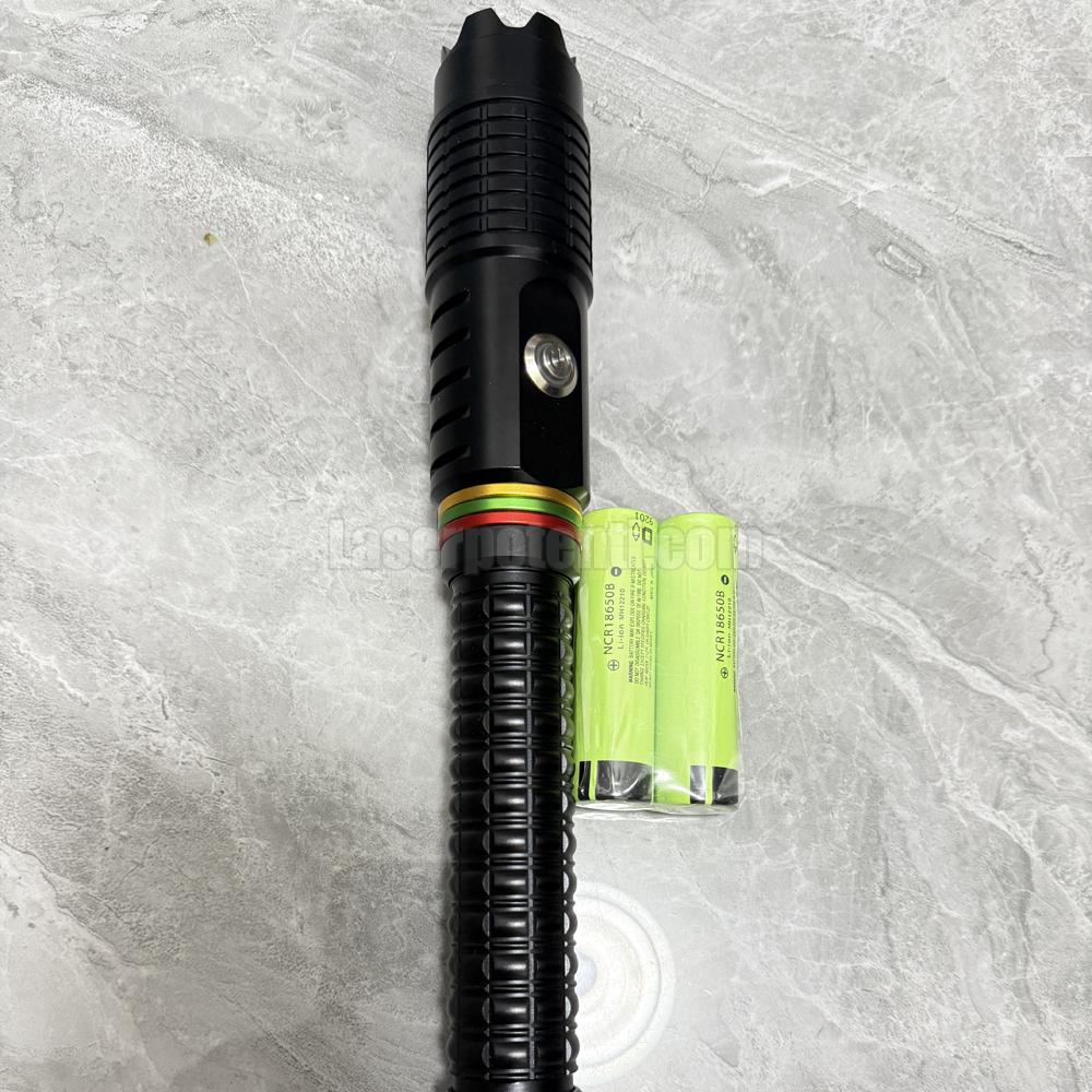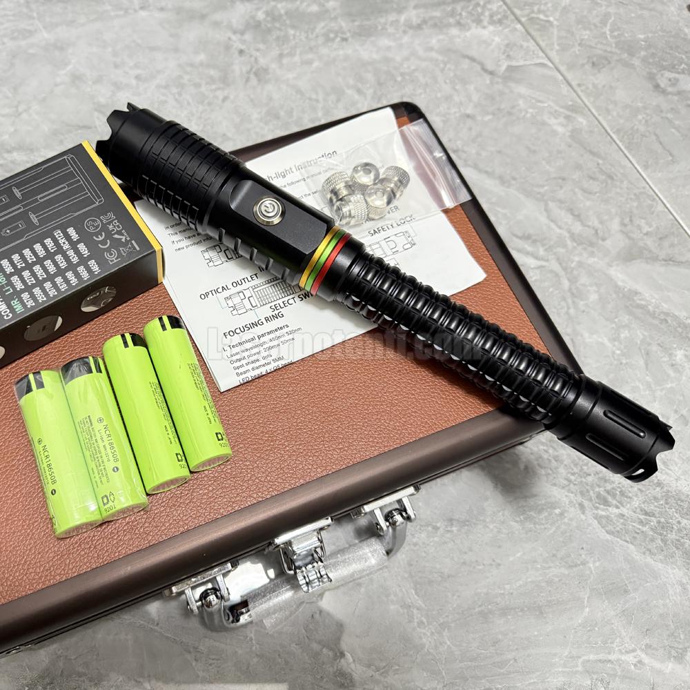 Specifiche • Potenza in uscita: 1,5 W / 2 W / 3 W • Lunghezza d'onda laser: 445 nm blu • Divergenza laser: < 2,0 mRad • Diametro del raggio: 1 mm all'apertura e regolabile per maggiore • Durata del diodo: > 6000 ore • Modalità di messa a fuoco: messa a fuoco regolabile • Materiale dell'alloggiamento: lega di rame ad alta densità • Modalità di uscita: bassa potenza, media potenza, alta potenza, strobo • Classe laser: laser di classe 4 • Metodo di alimentazione: 2 x batterie ICR18650 • Tensione di funzionamento: DC 7,0 V • Temperatura di funzionamento: -20 ℃ a +55 ℃ • Temperatura di stoccaggio: -40 ℃ a +80 ℃ • Peso netto: 217 g senza batteria • Dimensioni: Ø40 mm (testa) x Ø29 mm (coda) x 380 mm • Periodo di garanzia: un anno